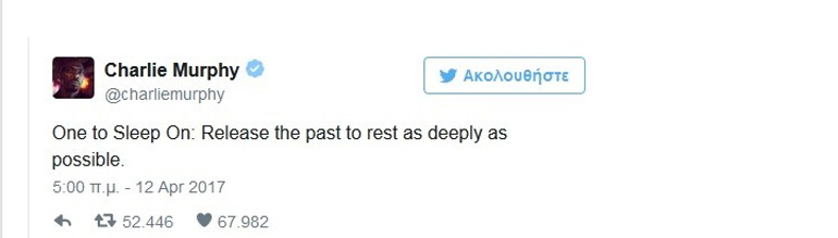 Η τελευταία ανάρτηση στον προσωπικό του λογαριασμό στο Τwitter είχε γίνει πριν από λίγες ώρες και έγραφε: «One to Sleep On: Release the past to rest as deeply as possible», «Τροφή για σκέψη: Απελευθερώσου από το παρελθόν για να αναπαυθείς όσο πιο βαθιά γίνεται».