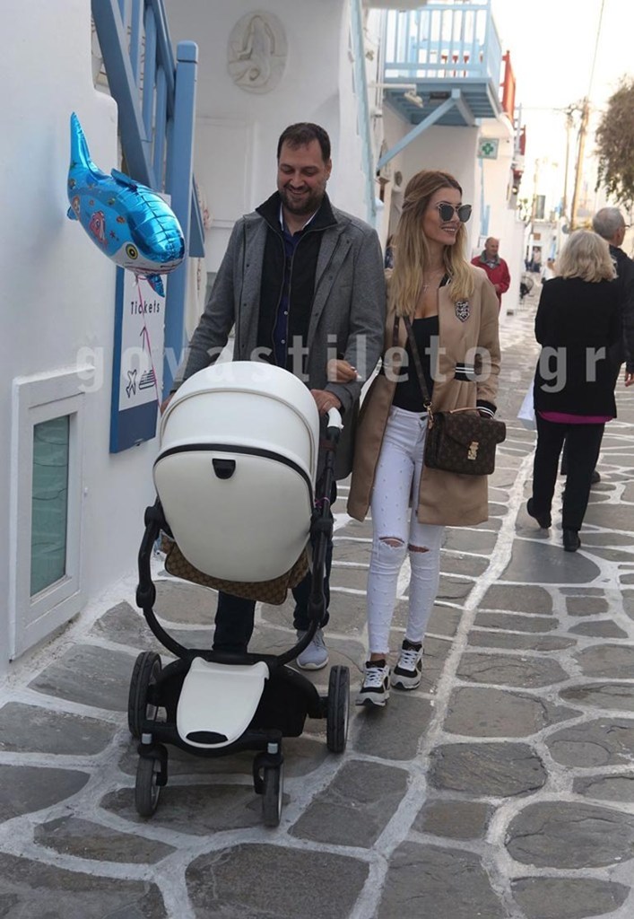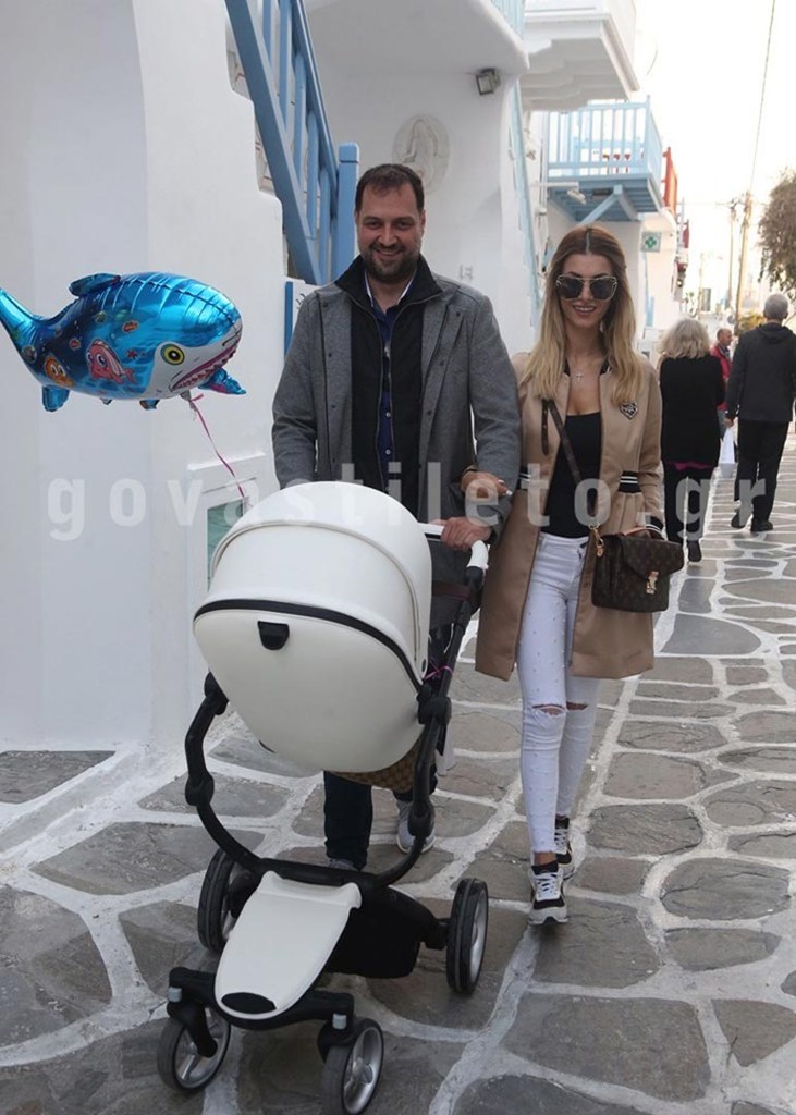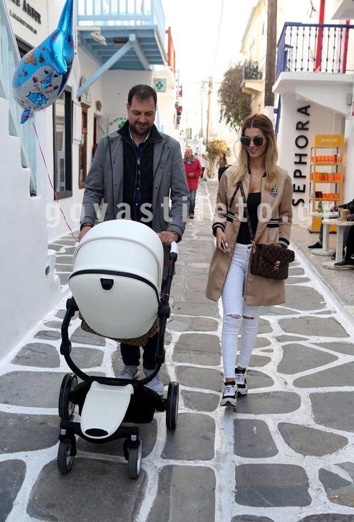 Ο φωτογραφικός φακός του govastileto.gr απαθανάτισε το ερωτευμένο ζευγάρι την ώρα που απολάμβανε τη βόλτα του με τον νεογέννητο γιο του στα φημισμένα σοκάκια της Μυκόνου.
