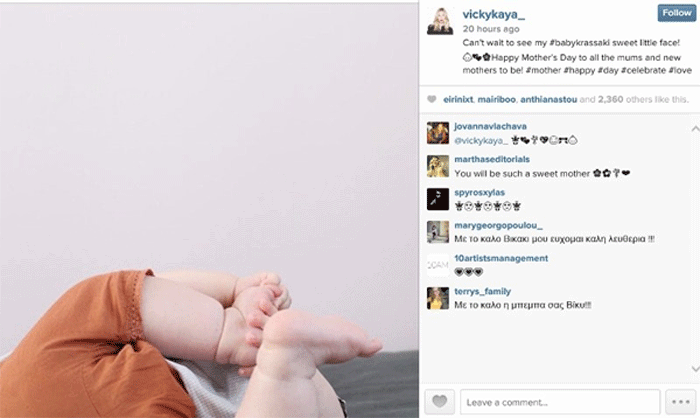 Η Βίκυ Καγιά εξέφρασε μέσω Instagram πως αδημονεί να έρθει η ώρα που θα σφίξει στην αγκαλιά της το «κρασάκι της», όπως το αποκαλεί! «Δεν βλέπω την ώρα να αντικρίσω το προσωπάκι από το «μωρό κρασσάκι» μου! Ευτυχισμένη μέρα της γυναίκας σε όλες της μαμάδες και στις μέλλουσες!» έγραψε χαρακτηριστικά κι «ανέβασε» φωτογραφία με τις πατούσες ενός μωρού.