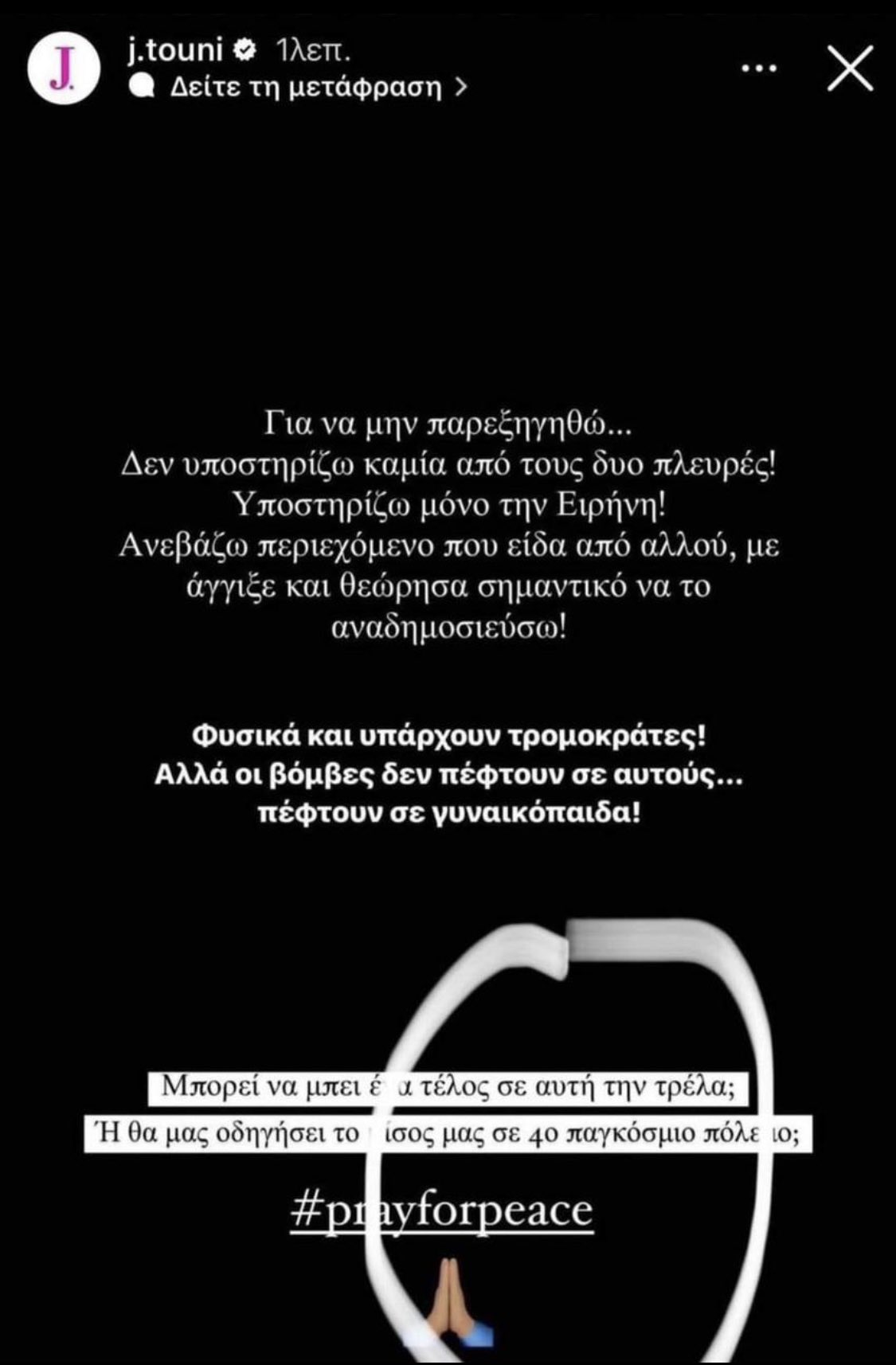 «Για να μην παρεξηγηθώ, δεν υποστηρίζω καμία από τις δυο πλευρές! Υποστηρίζω μόνο την ειρήνη! Ανεβάζω περιεχόμενο που είδα από αλλού, με άγγιξε και θεώρησα σημαντικό να το αναδημοσιεύσω! Φυσικά και υπάρχουν τρομοκράτες, αλλά οι βόμβες δεν πέφτουν σε αυτούς, πέφτουν σε γυναικόπαιδα! Μπορεί να μπει ένας τέλος σε αυτή την τρέλα; Ή θα μας οδηγήσει το μίσος μας σε 4ο παγκόσμιο πόλεμο; #prayforpeace» έγραψε χαρακτηριστικά.