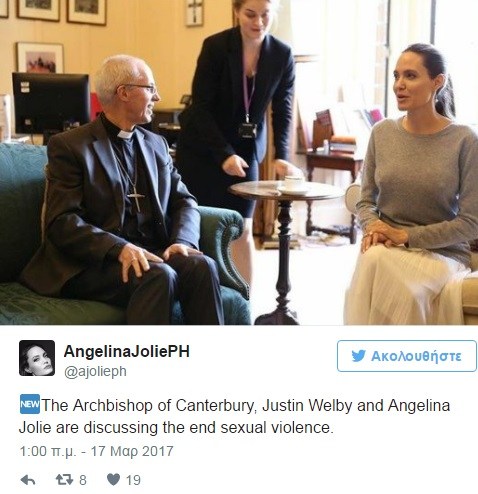 Η διάσημη ηθοποιός, ακτιβίστρια και πρέσβειρα του ΟΗΕ Αντζελίνα Τζολί συναντήθηκε πριν από δύο ημέρες με τον αρχιεπίσκοπο του Καντέρμπερι στο παλάτι Λάμπεθ του Λονδίνου, ώστε να συζητήσουν για τη σεξουαλική βία και το πώς θα δοθεί ένα τέλος σε αυτή.