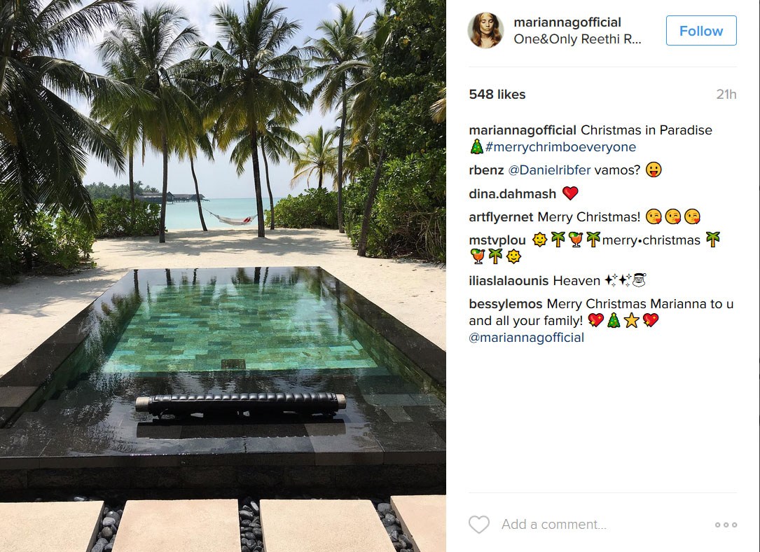Στις Μαλδίβες αποφάσισε να περάσει αυτά τα Χριστούγεννα η Μαριάννα Γουλανδρή με τον αγαπημένο της Φίλιππο Λαιμό. Μπορεί το ζευγάρι να ζει μόνιμα στο Λονδίνο αλλά το εξωτικό νησί είναι ένας πολύ αγαπημένος τους προορισμός καθώς πέρυσι το Γενάρη είχαν κάνει εκεί ένα μεγάλο πάρτι με αφορμή την απόφασή τους να παντρευτούν.