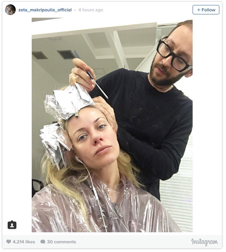 Η ηθοποιός που μας έχει συνηθίσει να τσαλακώνει την εικόνα της, δείχνει να πλήττει θανάσιμα, όσο ο κομμωτής της φτιάχνει τις ανταύγειες. Έτσι, για να «σκοτώσει» τον χρόνο αναμονής, βγάζει selfies, ούσα εντελώς άβαφη και με τα αλουμινόχαρτα στο κεφάλι!