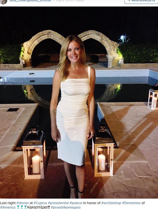 Η ηθοποιός-παρουσιάστρια ντυμένη στα λευκά, βρέθηκε στο Προεδρικό Μέγαρο και σε δείπνο που παρατέθηκε προς τιμήν του αρχιεπισκόπου Δημήτριου της Αμερικής.
