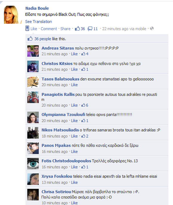 Τη γνώμη των θαυμαστών της στο facebook ζήτησε η παρουσιάστρια Νάντια Μπουλέ για το επεισόδιο Blackout που προβλήθηκε τη Δευτέρα από τον ΑΝΤ1...