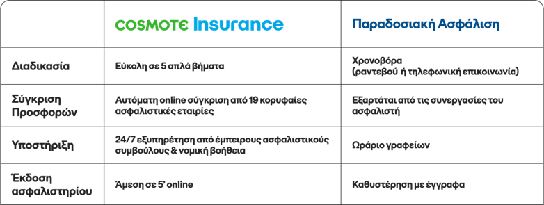 Με την online διαδικασία του COSMOTE Insurance υπάρχει δυνατότητα για σύγκριση πακέτου καλύψεων από τις κορυφαίες ασφαλιστικές εταιρείες της αγοράς, με απόλυτη διαφάνεια. Χωρίς δικαιολογητικά. Χωρίς τηλέφωνα. Χωρίς εκπλήξεις στην τιμή, με εύκολο και κατανοητό τρόπο.