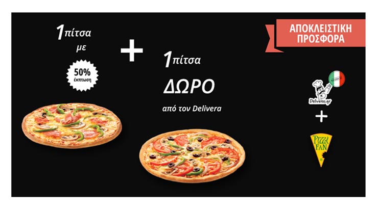 Μέσω του deliveras.gr παίρνεις μία pizza fan με έκπτωση -50% και άλλη μία δώρο από τον delivera!