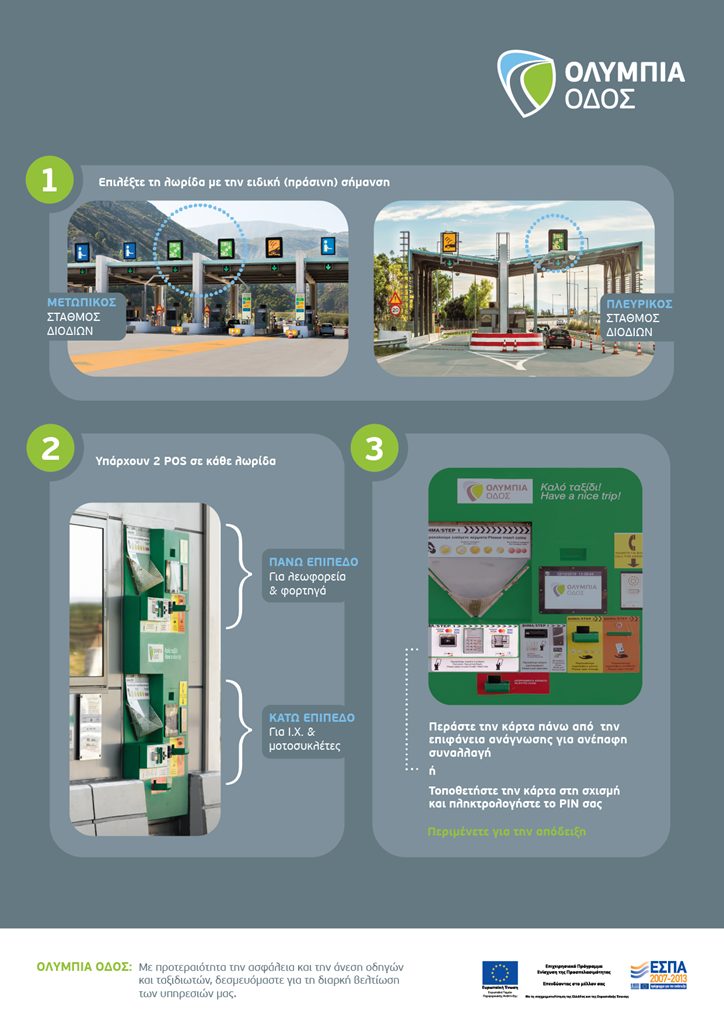 Δείτε στο συνημμένο αρχείο ή στο www.olympiaodos.gr οδηγίες για τον τρόπο χρήσης των POS στις λωρίδες με Μηχάνημα Αυτόματης Πληρωμής.