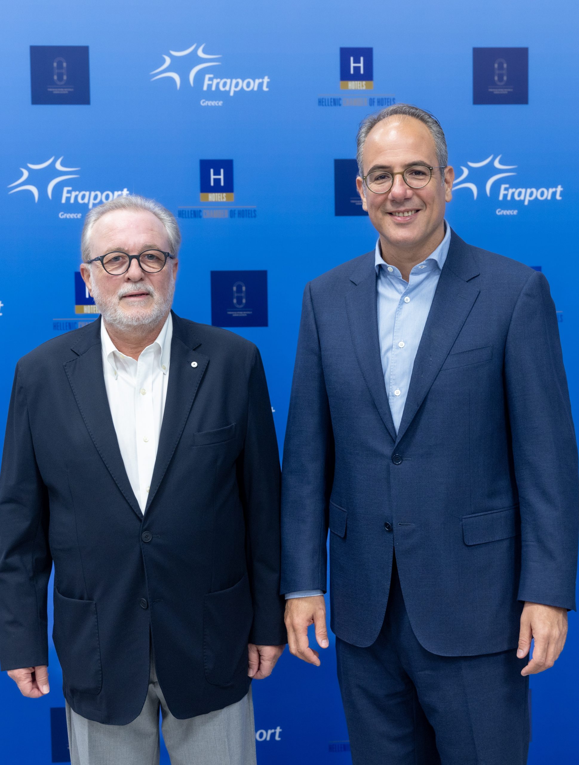 Από αριστερά προς δεξιά, κ. Σακελλάριος Σουλούνιας – Αντιπρόεδρος Ξενοδοχειακού Επιμελητηρίου Ελλάδος, κ. Γιώργος Βήλος – Γενικός Διευθυντής Ανάπτυξης Fraport Greece