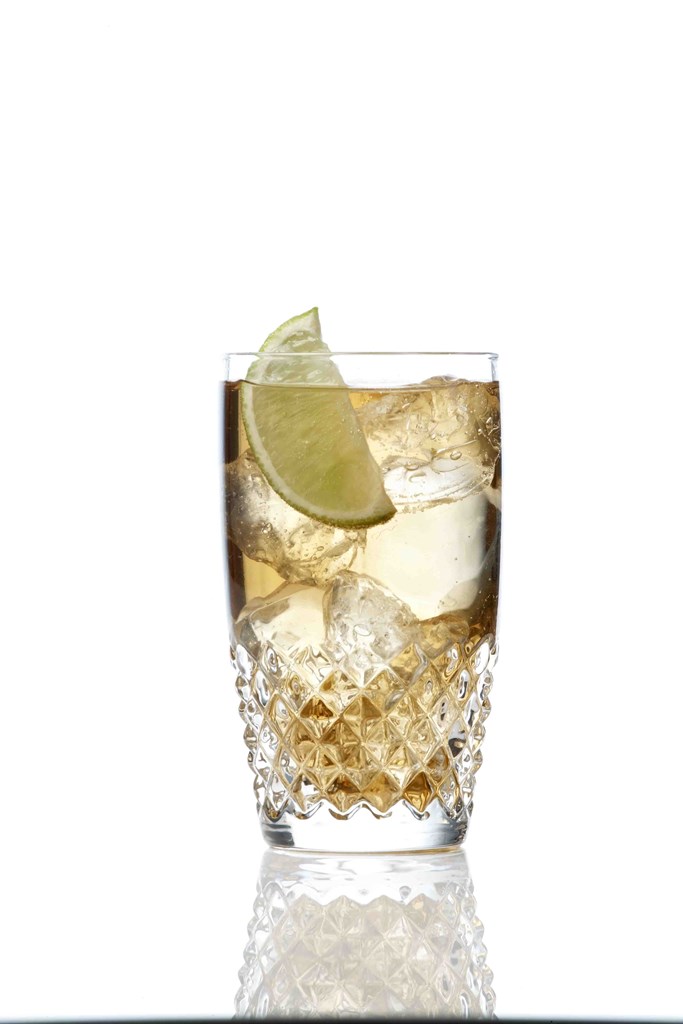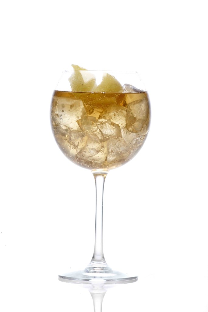 Ρίξτετο Samos Vin Doux σεποτήρι highball καιγεμίστεμε ginger ale. Γαρνίρετεμεένακομμάτι lime.