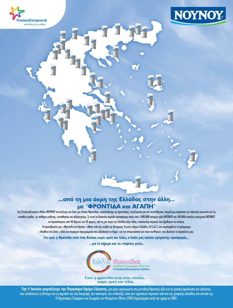 Κατά τη διάρκεια της πανδημίας, η FrieslandCampina Hellas – ΝΟΥΝΟΥ, μέσsα από σειρά δράσεων και ενεργειών, έχει προσφέρει συνολικά με «Φροντίδα και Αγάπη» πάνω από 1.900.000 ποτήρια γάλα ΝOYNOY και 140.000 κύπελλα γιαουρτιού ΝΟΥΝΟΥ ενισχύοντας περισσότερους από 40 δήμους και 45 Φορείς σε όλη τη χώρα. Ειδικότερα, έχει συνεργαστεί με τους 10 μεγαλύτερους Δήμους, όπως Αθηνών, Θεσσαλονίκης, Πειραιά, Ηρακλείου, Λαρισαίων, Βόλου, Περιστερίου, Ρόδου, Ιωαννίνων, Πύργου στηρίζοντας περίπου 44.000 συνανθρώπους μας. Ταυτόχρονα, στις πρωτοβουλίες προσφοράς της εταιρείας εντάσσονται περιοχές που τέθηκαν σε απομόνωση λόγω της πανδημίας, όπως η Δαμασκηνιά και Δραγασιά του Δήμου Βοΐου, Εχίνος του Δήμου Μύκης, Μεσοποταμία του Δήμου Καστοριάς, Φούστανη Αλμωπίας στην Πέλλα, καθώς και άλλες περιοχές που αντιμετωπίζουν σοβαρά προβλήματα όπως οι Δήμοι Ξάνθης, Καστοριάς, Κοζάνης, Χαλκίδας, Κομοτηνής, Ερμιονίδας, Μυτιλήνης, Ζακύνθου, οι οποίοι βοηθούν συνολικά πάνω από 9.000 ωφελούμενους.
