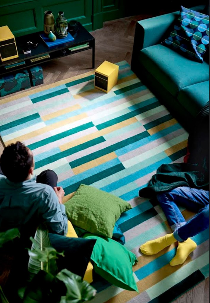 Τα νέα χαλιά, σε διαφορετικά μεγέθη ξεχωρίζουν λόγω της χειροποίητης κατασκευής τους και ομορφαίνουν κάθε γωνιά του σπιτιού. Επιπλέον, τα καλύμματα GILLHOV & MAJBRITT με έντονα τροπικά μοτίβα, σε πράσινο και κίτρινο χρώμα, δίνουν στον χώρο μας μια χαρούμενη νότα!
