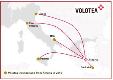 Το 2015, η Volotea θα εκτελέσει περισσότερες από 480 πτήσεις από την Αθήνα, με το δρομολόγιο Αθήνα – Βενετία να έχει το μεγαλύτερο μερίδιο. Η εταιρεία θα προσφέρει επίσης περισσότερες από 60.000 αεροπορικές θέσεις στους αναχωρούντες επιβάτες από την Αθήνα.