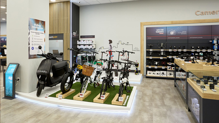 Υπάρχει ειδικό σημείο αφιερωμένο στην ηλεκτροκίνηση με πολλές επιλογές ποδηλάτων και πατινιών για βιώσιμη μετακίνηση μέσα στην πόλη.
