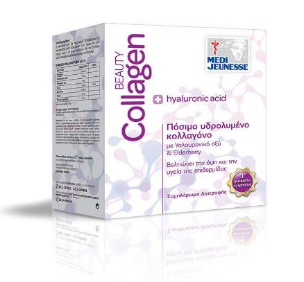 Το Beauty Collagen είναι εμπλουτισμένο με υαλουρονικό οξύ και Elderberry Beauty Collagen. Βελτιώνει την ελαστικότητα και την αντοχή του δέρματος, σταματά την διαδικασία της γήρανσης, δίνει λάμψη και σφριγηλότητα. Παραμένει βιολογικά ενεργό μέχρι να φτάσει στην εξωκυτταρική στοιβάδα του δέρματος.