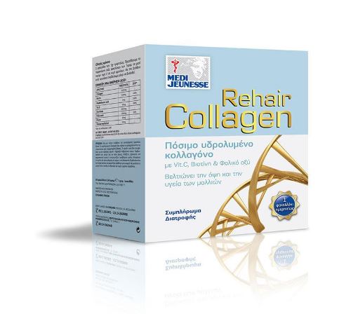 Συγκεκριμένα το Rehair Collagen είναι εμπλουτισμένο με Βιταμίνη C, βιοτίνη και φολικό οξύ. Βελτιώνει την όψη και την υγεία των μαλλιών. Σταματά την τριχόπτωση ΑΜΕΣΑ και προσφέρει σταδιακή πύκνωση του τριχωτού της κεφαλής. Το ειδικά σχεδιασμένο πόσιμο υδρολυμένο κολλαγόνο, με Βιταμίνη C, Βιοτίνη & Φολικό Οξύ, είναι η Νο1 επιλογή για ενδυνάμωση και αναζωογόνηση της τρίχας.
