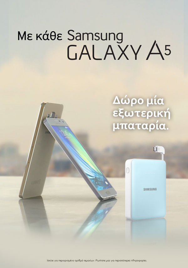 Η Samsung Electronics Hellas δίνει τη δυνατότητα σε όλους όσους αγόρασαν τα νέα smartphones Galaxy A3 και Galaxy A5, να διεκδικήσουν εκπληκτικά δώρα για τις καινούριες συσκευές τους. Όσοι έχουν αγοράσει το Samsung Galaxy A5 μετά τις 11 Μαρτίου, μπορούν να αποκτήσουν δωρεάν μια εξωτερική μπαταρία, ώστε να απολαμβάνουν το αγαπημένο τους smartphone για ακόμα περισσότερη ώρα. Αντίστοιχα, εκείνοι που αγόρασαν το Samsung Galaxy A3 μπορούν να αποκτήσουν μια μοναδική θήκη για το κινητό τους, που ταιριάζει στο δικό τους στυλ, επιλέγοντας ανάμεσα σε πέντε διαθέσιμα σχέδια. Η προσφορά ισχύει για αγορές που πραγματοποιήθηκαν είτε ηλεκτρονικά είτε σε κατάστημα μέσα από το επίσημο δίκτυο συνεργατών της Samsung Electronics Hellas.