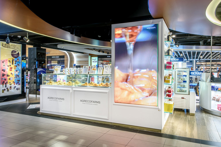 Οι επισκέπτες επιλέγουν τα λαχταριστά εδέσματα, ποτά, το λάδι και το μέλι της φάρμας AgrecoFarms βλέποντας ταυτόχρονα όλη τη διαδικασία παραγωγής τους στο ενσωματωμένο στο περίπτερο videowall και τα παραλαμβάνουν σε κομψές συσκευασίες, προορισμένες για ίδια χρήση ή για δώρο. Τα αναφερόμενα προϊόντα αποτελούν σήμερα Best-sellers στα καταστήματα Duty Free των ελληνικών αεροδρομίων, ενώ έχουν επιλεγεί αυστηρά από τοπικούς εξειδικευμένους παραγωγούς εμπλουτίζοντας την γκάμα ποιοτικών προϊόντων της φάρμας.