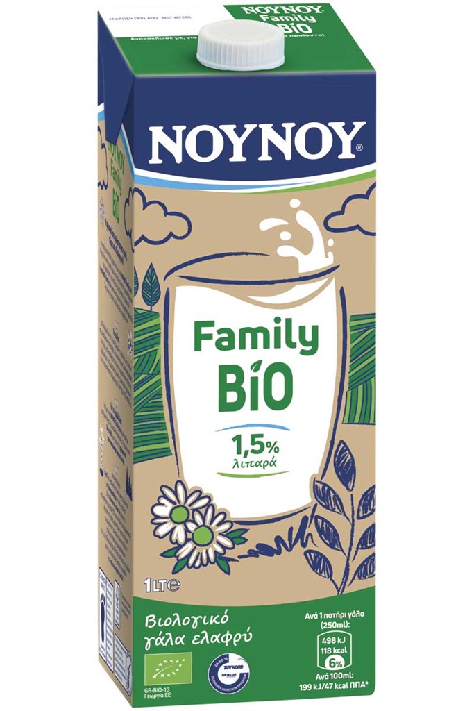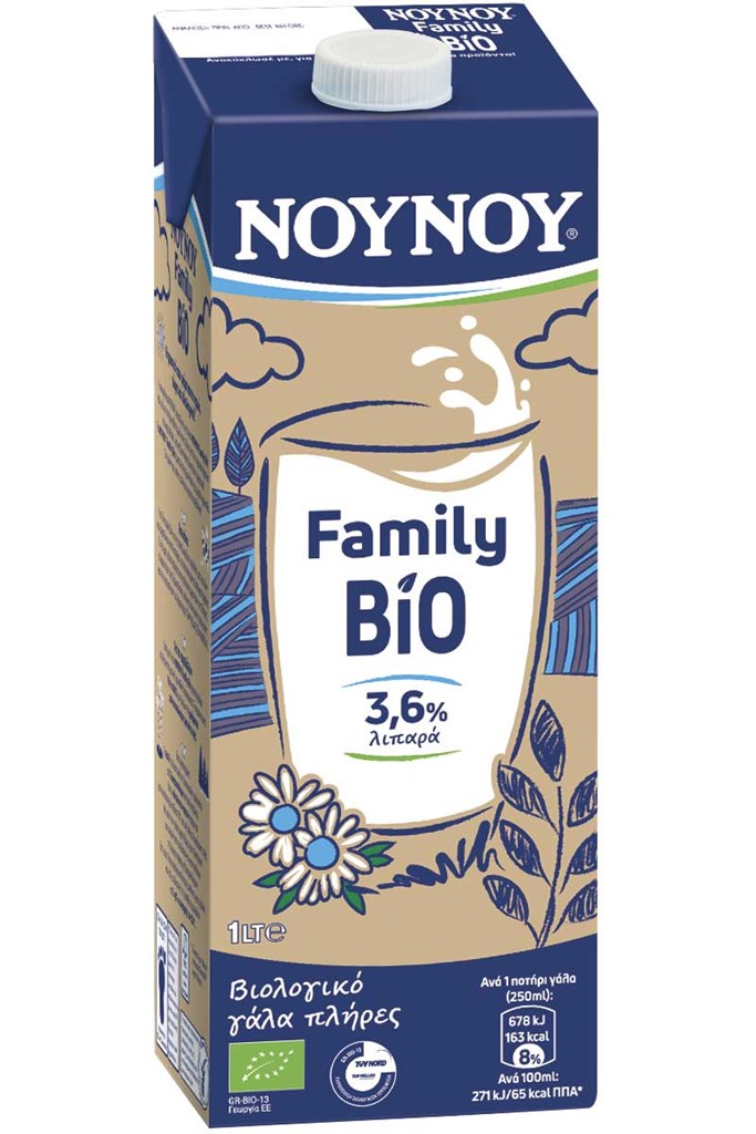 Το νέο αγνό βιολογικό γάλα είναι πλούσιo σε γεύση και θρεπτικά συστατικά όπως πρωτεΐνες, ασβέστιο και βιταμίνες (Β2 & Β12), που φορτίζουν την κάθε ημέρα φυσικά. Προέρχεται από καλοζωισμένες αγελάδες που ζουν και μεγαλώνουν στην ύπαιθρο, σε πιστοποιημένες βιολογικές φάρμες σύμφωνα με τους Ευρωπαϊκούς κανόνες βιολογικής παραγωγής, ενώ παράγεται και συσκευάζεται στο Πρότυπο Eργοστάσιο ΝΟΥΝΟΥ της FrieslandCampina Hellas στην Πάτρα. Όλα τα στάδια της αλυσίδας παραγωγής του ΝΟΥΝΟΥ Family Bio, από τις φάρμες μέχρι και την τελική παράδοση του προϊόντος στους πελάτες, είναι πιστοποιημένα από τον Οργανισμό TUV HELLAS. Διατίθεται σε οικολογική συσκευασία, της οποίας το 60% του πλαστικού είναι από ζαχαροκάλαμο, ενώ το 100% του χαρτιού προέρχεται από πιστοποιημένα δάση FSC® και από άλλες ελεγχόμενες πηγές, συμβάλλοντας στη μείωση εκπομπών CO2 κατά 19%*. Η FrieslandCampina Hellas-NOYNOY πρωτοπορεί για άλλη μια φορά, καθώς η νέα συσκευασία είναι η πρώτη και μοναδική που παράγεται στην ελληνική αγορά σε συνεργασία με την Tetra Pak.
