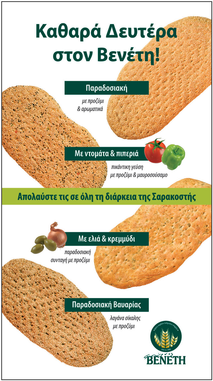 Τέσσερα είδη λαγάνας προτείνει παραδοσιακά ο φούρνος ΒΕΝΕΤΗ για την Καθαρή Δευτέρα, διατηρώντας την υψηλή ποιότητα των υλικών του.