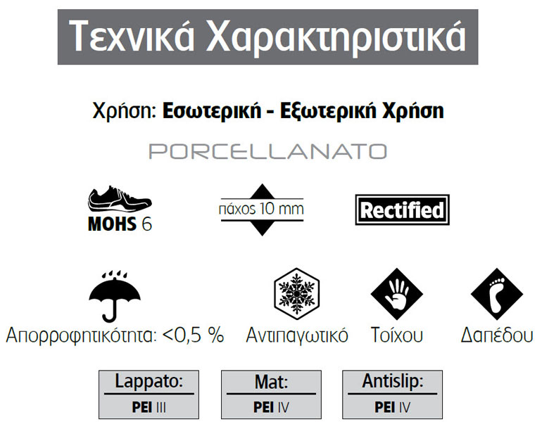 Η τεράστια ποικιλία και ευελιξία της σειράς αντικατοπτρίζεται και στο γεγονός ότι εκτός από 4 χρώματα, προσφέρεται σε 4 διαφορετικές διαστάσεις (30 x 60 – 60 x 60 – 80 x 80 – 60 x 120) και σε 3 διαφορετικές υφές: lappato (ημιγυαλιστερό), mat R9 και R11 Antislip (κατάλληλο για περιβάλλον χώρο πισίνας).