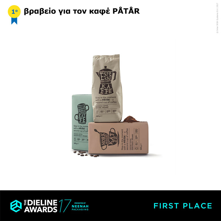 Ακόμα μία σημαντική διάκριση για την ΙΚΕΑ, στον αναγνωρισμένο θεσμό για τον σχεδιασμό συσκευασίας “Dieline Awards 2017”. Συγκεκριμένα, η ΙΚΕΑ απέσπασε το 1ο βραβείο στην κατηγορία μη αλκοολούχων ποτών, για τον σχεδιασμό της συσκευασίας καφέ PÅTÅR.