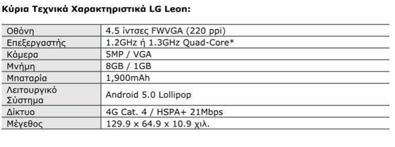 Το νέο «λιοντάρι» της LG, το LG Leon, ενσωματώνει το πνεύμα της καινοτομίας της εταιρείας σε μια εξαιρετικά δυνατή συσκευή. Η ελαφρώς κυρτή οθόνη αφής 4.5 ιντσών, διαθέτει προηγμένη τεχνολογία in-cell, που ουσιαστικά επιτρέπει στις συσκευές να είναι ακόμα πιο λεπτές, ενώ μεγιστοποιεί ταυτόχρονα την επιφάνεια της οθόνης ελαχιστοποιώντας το πλαίσιο (bezel). Οι βελτιωμένοι αισθητήρες της τεχνολογίας in-cell προσφέρουν επιπλέον πιο γρήγορη ανταπόκριση, καλύτερη ορατότητα στο φυσικό φως και πιο ζωντανές εικόνες. Το νέο smartphone διαθέτει επίσης κάμερα ανάλυσης 5 megapixel, ισχυρό επεξεργαστή 1.2GHz Quad-Core και μπαταρία ισχύος 1,900mAh.
