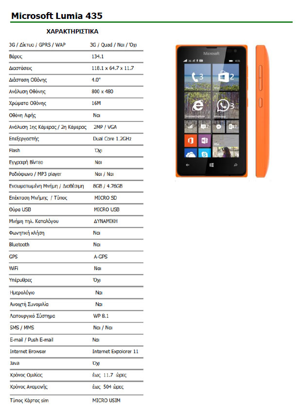 Το Microsoft Lumia 435 διατίθεται σε πορτοκαλί, λευκό και μαύρο χρώμα, ακόμα πιο φθηνά με σύνδεση στα προγράμματα COSMOTE, σε όλα τα καταστήματα ΟΤΕ, COSMOTE, ΓΕΡΜΑΝΟΣ.