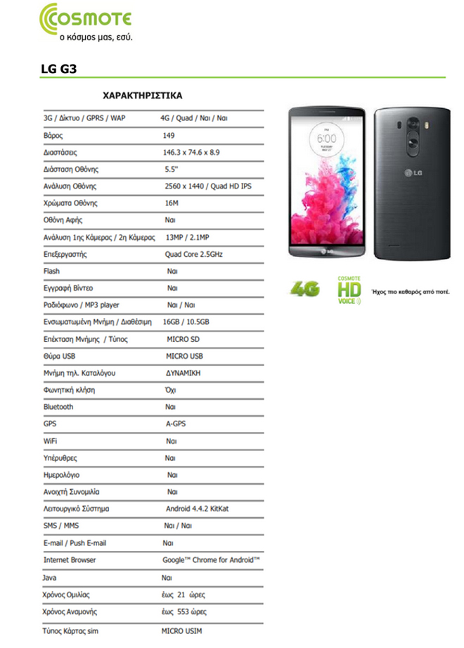 Το LG G3, είναι μια ακόμα εξαιρετική προσθήκη στη μεγαλύτερη 4G γκάμα Smartphones που διαθέτει η COSMOTE στην ελληνική αγορά. Για να μπορεί κανείς να απολαμβάνει απίστευτα γρήγορο Mobile Internet με το 4G δίκτυο της COSMOTE, με την μεγαλύτερη πληθυσμιακή κάλυψη στην Ελλάδα. Χαρακτηριστικά, για τον μήνα Ιούνιο το Mobile Internet της COSMOTE κατέγραψε μέσο όρο ταχύτητας downloading 15,7mbps, σύμφωνα με μετρήσεις κοινού στο SpeedTest του ανεξάρτητου φορέα OOKLA, της πιο διαδεδομένης εφαρμογής μετρήσεων internet παγκοσμίως.