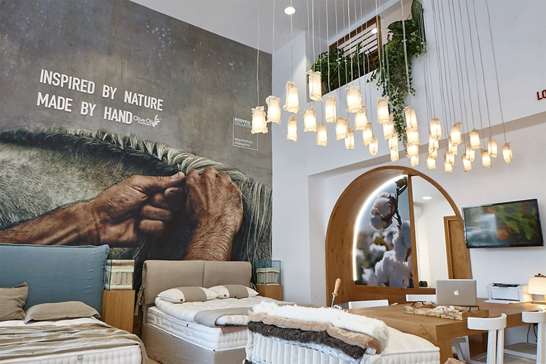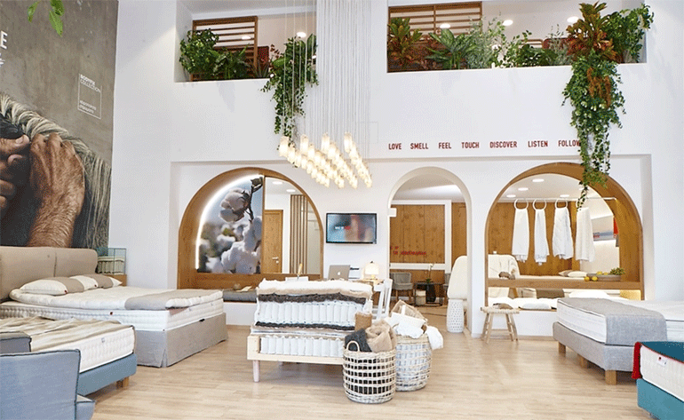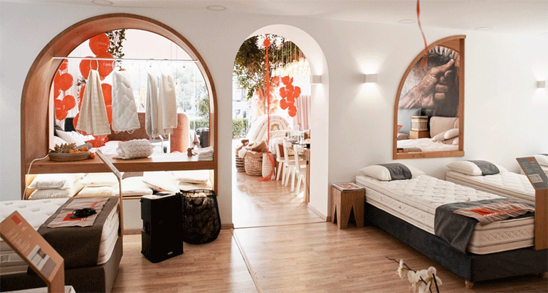 Η αρχιτεκτονική του καταστήματος απλώνεται σε 150 τ.μ. και 2 επίπεδα και βασικός της στόχος είναι να μεταφέρει τον επισκέπτη σε ένα «ξύπνημα» στον κόσμο και την αύρα της Μεσογείου.