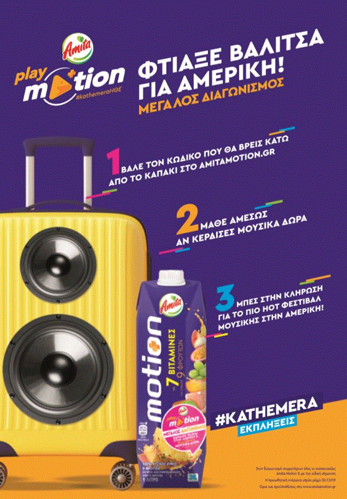 Η Amita Motion, γνωστή στους νέους για τη διαχρονική σχέση της με τη μουσική, φέτος δημιουργεί τη νέα μουσική πλατφόρμα Playmotion, μεταφέροντάς μας τα μοναδικά συναισθήματα της Ημέρας Θετικής Ενέργειας όλη τη χρονιά! Με δράσεις, που θα ξεκλειδώνουν σταδιακά, #kathemera είναι πλέον Ημέρα Θετικής Ενέργειας, #kathemera η μουσική είναι κοντά μας, #kathemera είναι μια εμπειρία, #kathemera υπάρχουν ξεχωριστοί διαγωνισμοί για να μας εκπλήξουν.