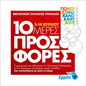 Την έναρξη δεκαήμερου προσφορών από την Πέμπτη 5 Ιουλίου έως και την παραμονή της επίσημης έναρξης των εκπτώσεων, το Σάββατο 14 Ιουλίου, ανακοίνωσε ο Εμπορικός Σύλλογος Τρίπολης με τη συμμετοχή όλων των εμπορικών καταστημάτων της πόλης.