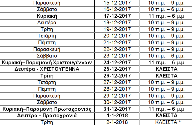 Από τον Εμπορικό Σύλλογο Θεσσαλονίκης ανακοινώθηκε το ωράριο λειτουργίας των εμπορικών καταστημάτων, κατά τη διάρκεια των εορτών.