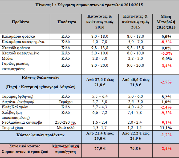 Μειωμένη κατά -2,4% θα είναι η τιμή του σαρακοστιανού τραπεζιού, σύμφωνα με έρευνα του Ινστιτούτου Εμπορίου & Υπηρεσιών που δημοσιεύει η Ελληνική Συνομοσπονδία Εμπορίου και Επιχειρηματικότητας.