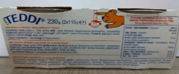 Πρόκειται για το παιδικό επιδόρπιο γιαουρτιού με βερίκοκο με την εμπορική ονομασία «Teddi Yogurt Kids Bio» σε χάρτινη συσκευασία των 230 γρ. που περιλαμβάνει 2 τεμάχια των 115 γρ. έκαστο, με αριθμό παρτίδας L.171024 και ημερομηνία λήξης 24.10.2017.