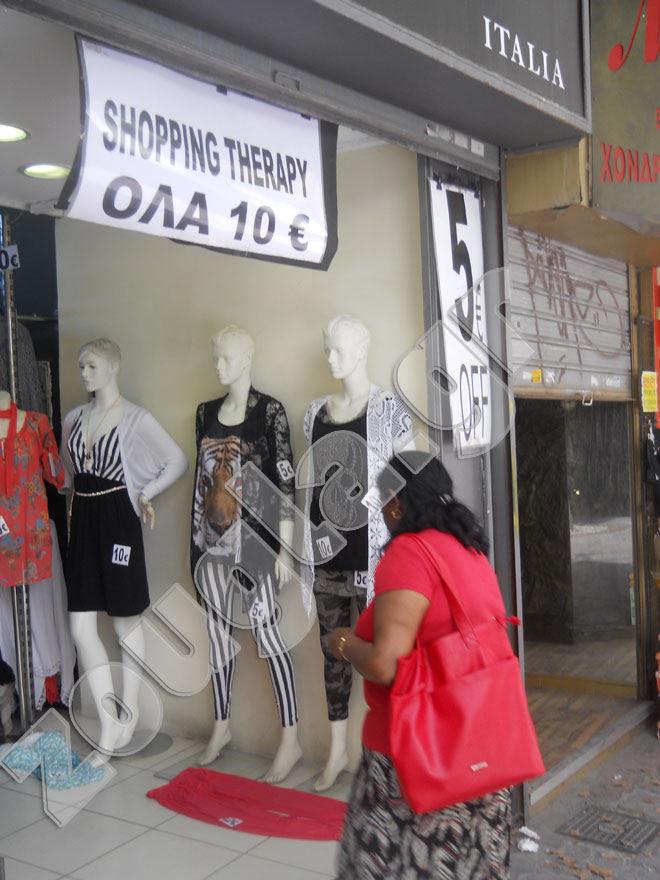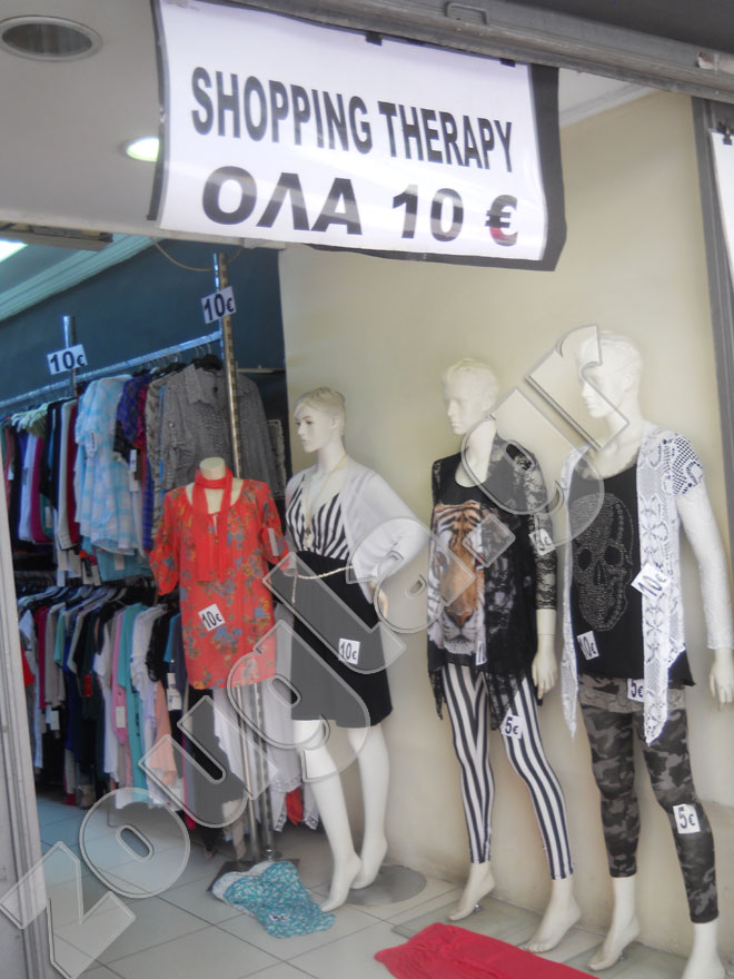 Να κάνουν shopping therapy αγοράζοντας στην ενιαία τιμή των 10 ευρώ το κομμάτι, προτρέπει τους καταναλωτές σήμερα, ένας ιδιοκτήτης καταστήματος ρουχισμού στην οδό Αγίου Μάρκου στο Μοναστηράκι.
