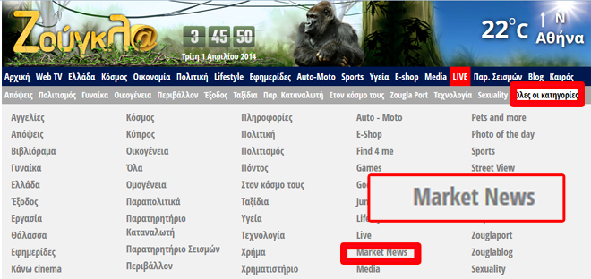 Στην αρχική σελίδα του zougla.gr, εάν οδηγήσετε τον κέρσορα στο εικονίδιο ΟΛΕΣ ΟΙ ΚΑΤΗΓΟΡΙΕΣ, θα ανοίξει ένα μεγάλο παράθυρο με τους τομείς της εφημερίδας μας. Στην τέταρτη στήλη θα συναντήσετε την κατηγορία MARKET NEWS: