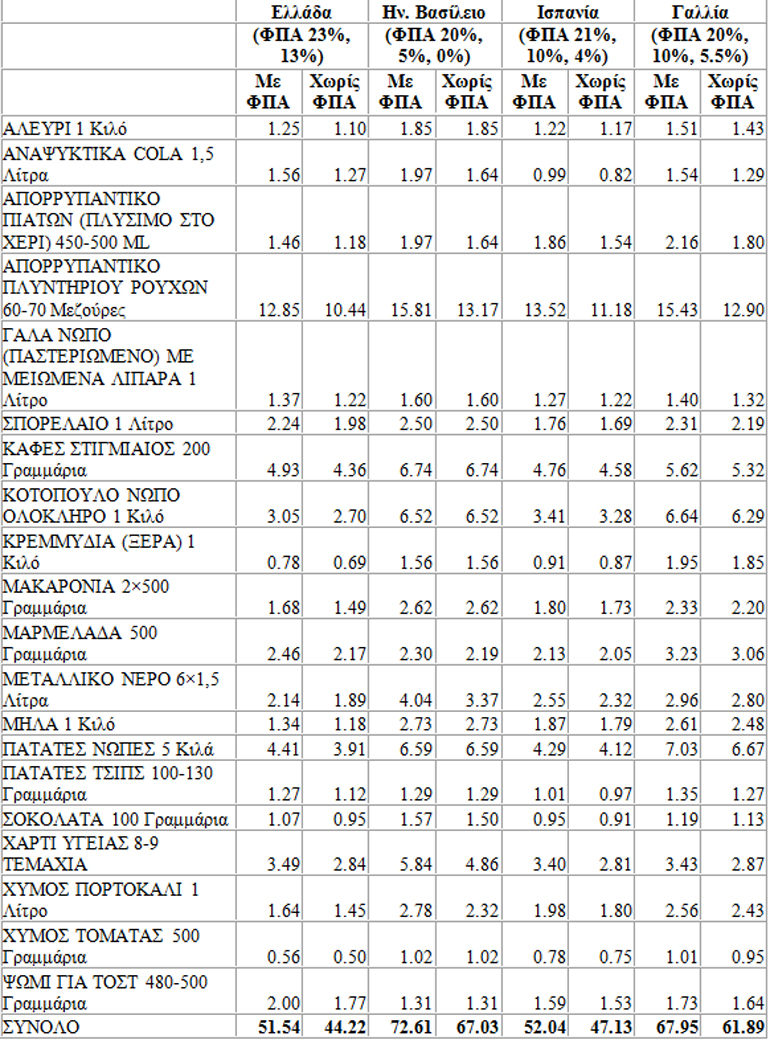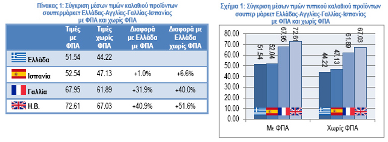 Η σύγκριση των μέσων τιμών των καλαθιών (πίνακας 1) δείχνει ότι και οι δύο χώρες τη συγκεκριμένη χρονική περίοδο έχουν σημαντικά ακριβότερο μέσο καλάθι από την Ελλάδα, 32% η Γαλλία και 40% η Αγγλία, ενώ η Ισπανία έχει ακριβότερο καλάθι κατά 1%. Η εικόνα των αποτελεσμάτων αλλάζει σημαντικά όταν αφαιρέσουμε τον αναλογούντα ΦΠΑ ανά χώρα για να αντιληφθούμε τις πραγματικές τιμές των προϊόντων σουπερμάρκετ. Η σύγκριση των καλαθιών σε αυτή την περίπτωση (σχήμα 1) δείχνει ότι οι τρεις χώρες έχουν ακόμα πιο ακριβό μέσο καλάθι από την Ελλάδα, η Ισπανία κατά 7%, η Γαλλία κατά 40% και η Αγγλία κατά 52%.