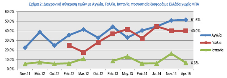 Αξίζει όμως να σημειωθεί ότι σε σχέση με τη Γαλλία και την Αγγλία η ποσοστιαία διαφορά με την Ελλάδα φαίνεται πως μεγαλώνει εξαιτίας κυρίως του αποπληθωρισμού στην Ελλάδα και του πληθωρισμού σε αυτές τις χώρες, καθώς και λόγω των εξελίξεων της ισοτιμίας Ευρώ-Λίρα Αγγλίας που επηρεάζει τη σύγκριση με την Αγγλία.