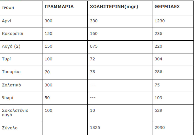 Σχετικός πίνακας, με τις θερμίδες και τα ποσά χοληστερίνης, που καταναλώνουμε στο Πασχαλινό μας τραπέζι.