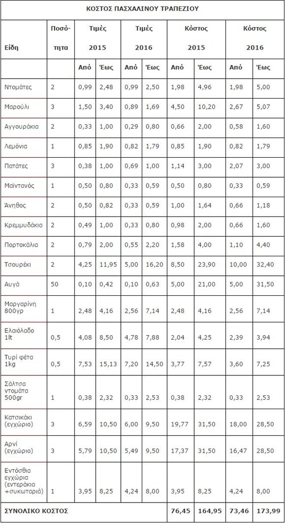 Το ΚΕ.Π.ΚΑ. υπολογίζει ότι το φετινό Πασχαλινό τραπέζι, για 8 -10 άτομα, με μαγειρίτσα, δύο κύρια πιάτα, δύο σαλάτες, τσουρέκι, αυγά και φρούτα, θα στοιχίσει από 73,46 ευρώ έως 173,99 ευρώ. Δηλαδή, από -3,90 % έως + 5,48%, σε σχέση με πέρυσι.