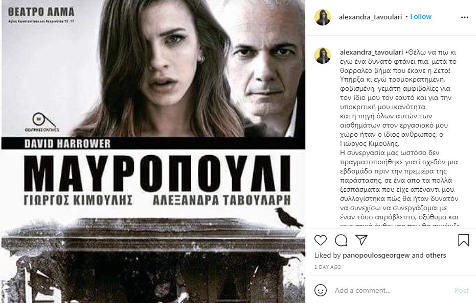 Συγκεκριμένα η Α. Ταβουλάρη μέσα από ανάρτηση μιας φωτογραφίας στον προσωπικό της λογαριασμό στο instagram στην οποία απεικονίζεται η ίδια με τον Γ. Κιμούλη ανέφερε τα εξής: