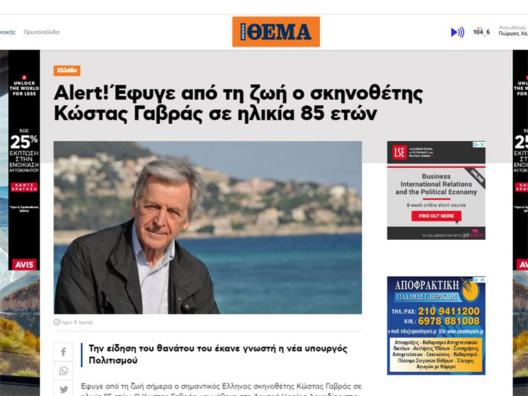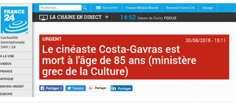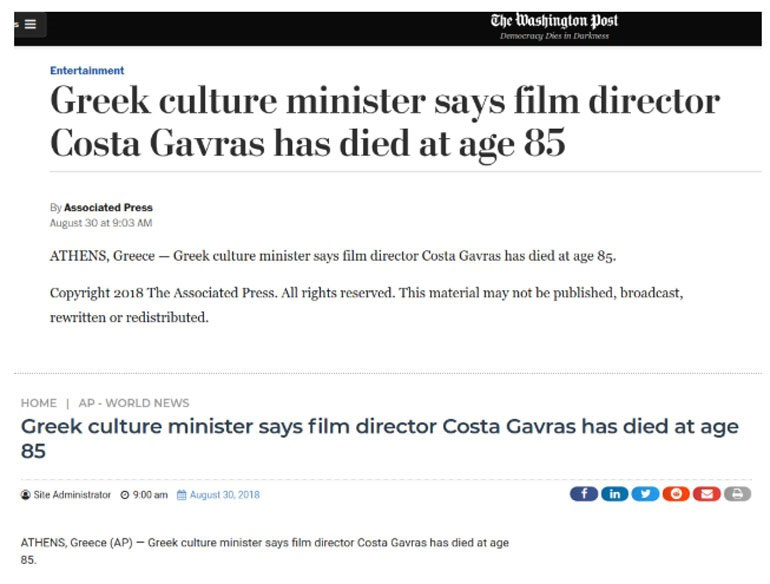 Το Διοικητικό Συμβούλιο της ΕΣΗΕΑ εξέδωσε ανακοίνωση σχετικά με την αναπαραγωγή της ψευδούς είδησης για τον θάνατο του σκηνοθέτη Κώστα Γαβρά.