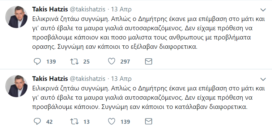 Ο Χατζής αναρτά στο Twitter τρία μηνύματα-συγγνώμες