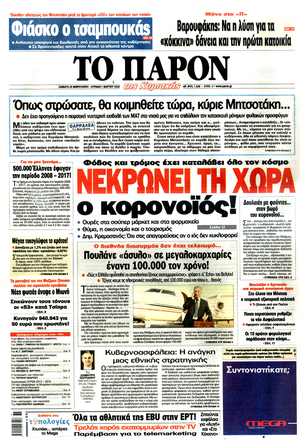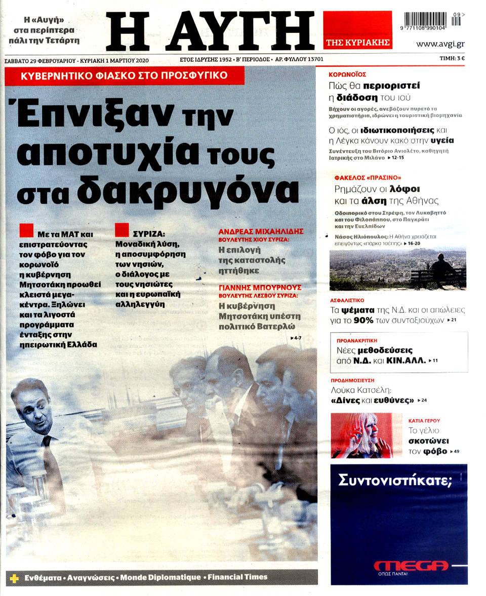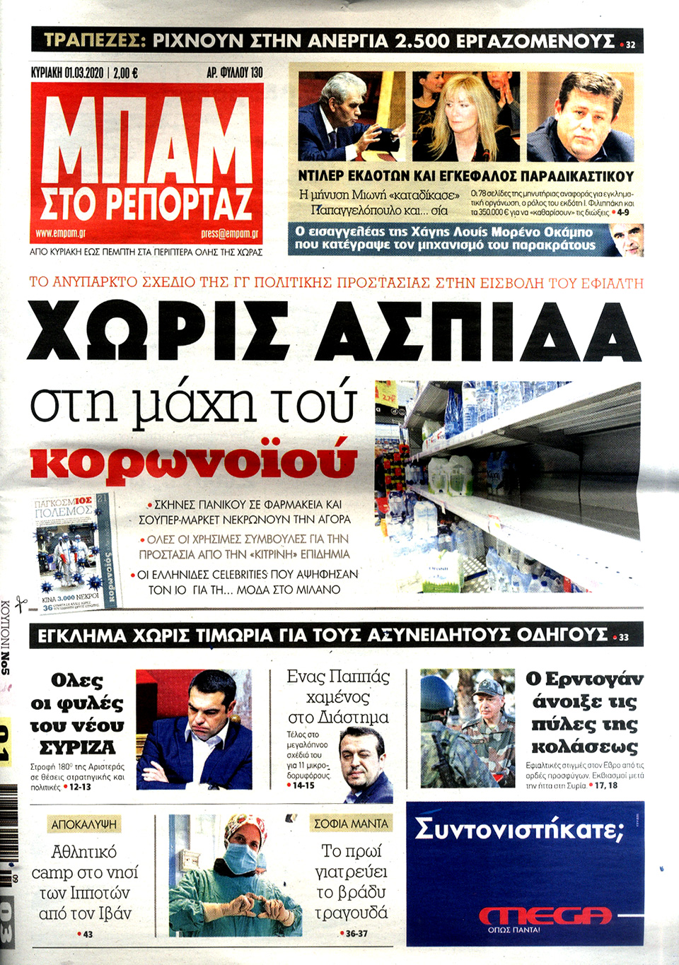 Διαβάστε στο zougla.gr τα πρωτοσέλιδα και τα οπισθόφυλλα των εφημερίδων του Σαββάτου και των φύλλων της Κυριακής που κυκλοφορούν εκτάκτως.