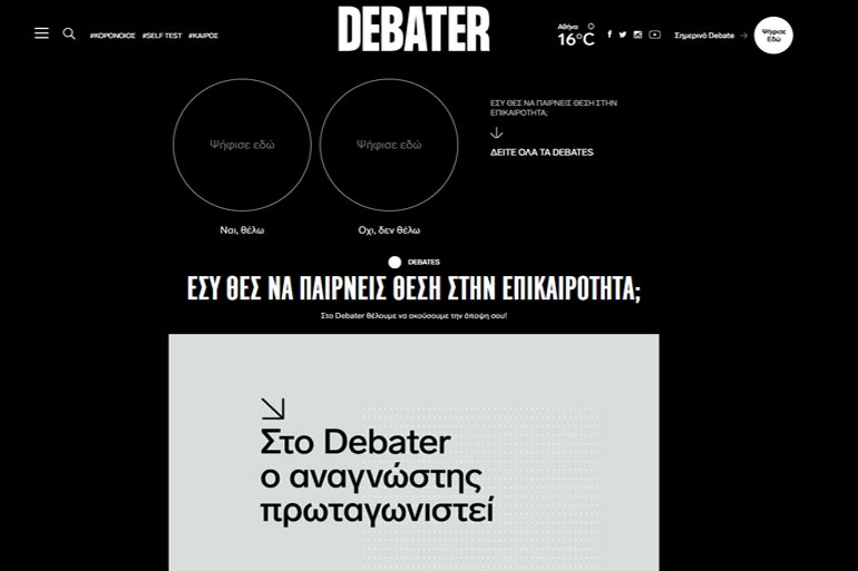 Στο Debater.gr, ο αναγνώστης πρωταγωνιστεί. Όπως δηλώνουν οι δημιουργοί του, «είναι το μοναδικό ειδησεογραφικό site στην Ελλάδα όπου ο αναγνώστης ενημερώνεται, ψηφίζει, παίρνει θέση σε θέματα της επικαιρότητας».