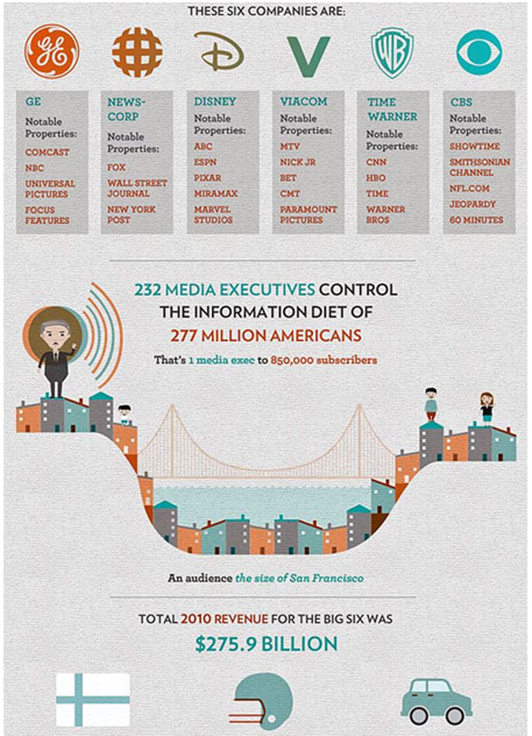 Λοιπόν, έξι είναι οι αμερικάνικες εταιρίες που ελέγχουν τα μεγαλύτερα αμερικανικά ραδιοτηλεοπτικά δίκτυα, όπως διακρίνεται και στο γράφημα που δημοσίευσε ο ιστότοπος «informationclearinghouse.info».