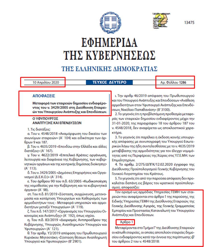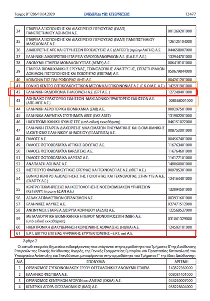 Σύμφωνα με το ΦΕΚ, η ΕΡΤ και το ΑΠΕ περιλαμβάνονται σε μία μακρά λίστα επιχειρήσεων και φορέων του Δημοσίου και του ευρύτερου δημόσιου τομέα όπως η ΕΑΒ (Ελληνική Αμυντική Βιομηχανία), τα Ελληνικά Αμυντικά Συστήματα, η Ηλεκτρομαγνητική Κύμης, η οποία μάλιστα τελεί υπό ειδική εκκαθάριση, η Ελληνική Διαχειριστική Εταιρεία Υδρογονανθράκων Α.Ε., ο Οργανισμός Αστικών Συγκοινωνιών Αθηνών και Θεσσαλονίκης, οι Ελληνικές Αλυκές Α.Ε. και εταιρείες διαχείρισης περιουσίας Πανεπιστημιακών Ιδρυμάτων, που χαρακτηρίζονται ως εταιρείες «δημοσίου ενδιαφέροντος κατά την έννοια της περίπτωσης ιβ του άρθρου 2 του ν. 4548/2018».