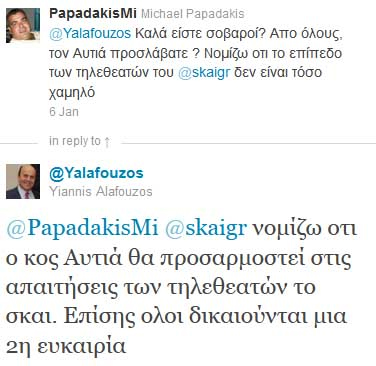 Ο Γιάννης Αλαφούζος, απατώντας σε ερώτηση διαδικτυακού φίλου του ΣΚΑΪ στο Twitter για την πρόσληψη του Γιώργου Αυτιά, αναγκάστηκε να υπεραμυνθεί της επιλογής του, αλλά και να αφήσει υπονοούμενα.
