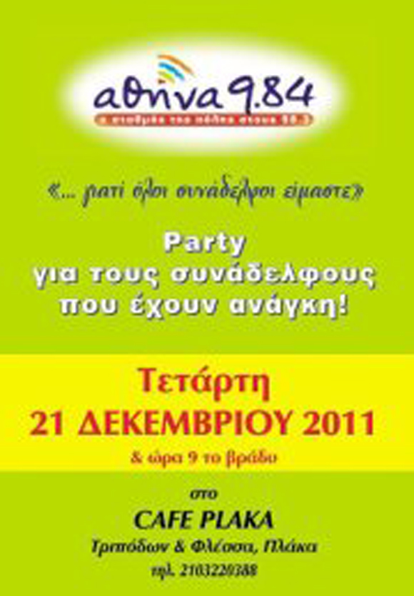 Οι εργαζόμενοι στον ΑΘΗΝΑ 9.84 διοργανώνουν το πάρτι με τον τίτλο «… γιατί όλοι συνάδελφοι είμαστε», με σκοπό να συγκεντρωθούν χρήματα, τα οποία θα διατεθούν σε συναδέλφους τους που βάλλονται οικονομικά.